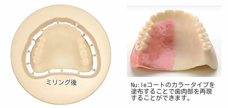 YAMAKIN株式会社のKZR-CAD デンチャーPCでは、白単色のディスクをミリングして義歯を製作し、後から歯肉の部分の塗装をします。