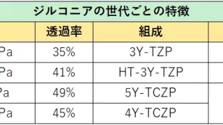 初期のジルコニアは透過性が低く単独では使用不可でしたが、現在では透過性が向上し前歯部にもジルコニア単独で使用出来るようになりました。一言にジルコニアといっても、世代によって特徴が違うので、本記事では世代ごとに分けて特徴をまとめていきます。
