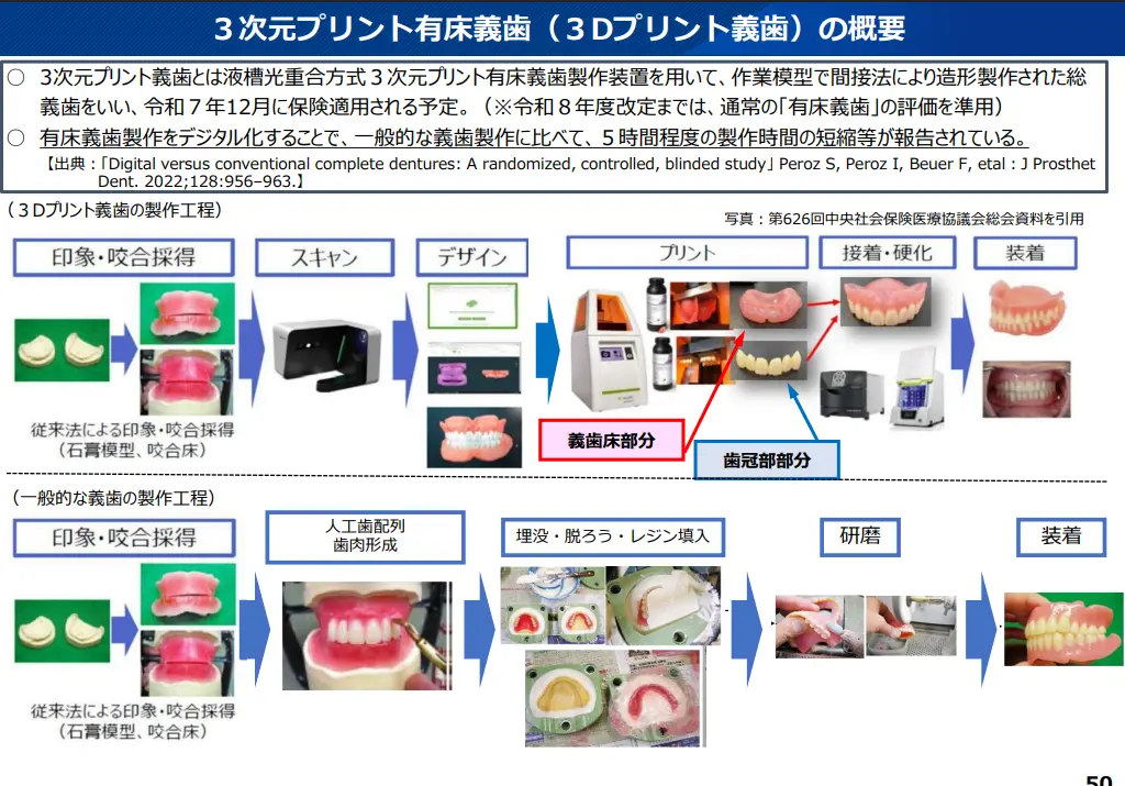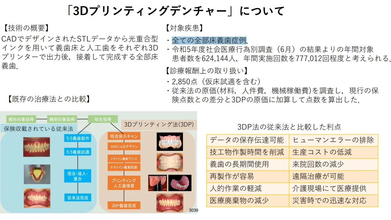 令和7年12月1日より、CAD/CAM義歯の保険収載が決定しましたが、さっそく3Dプリントデンチャーの適応拡大の技術提案がなされています。
