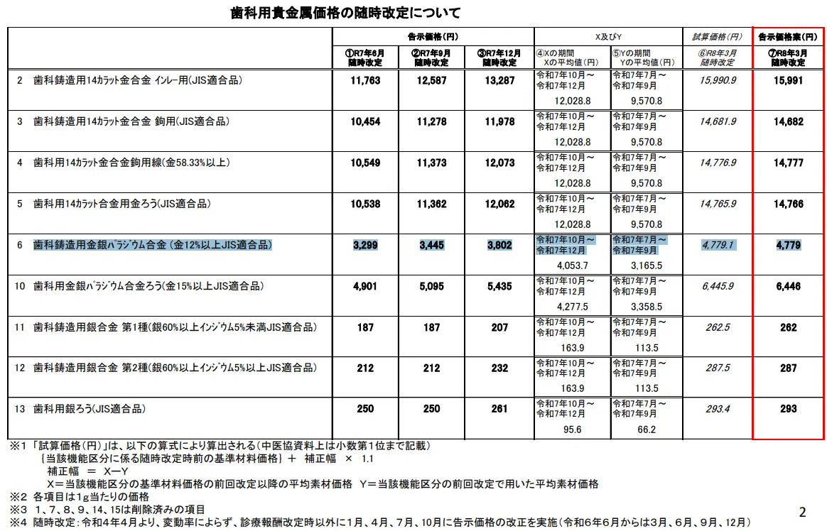 金銀パラジウム合金はここ十数年価格上昇が続いており、2010年4月1日に619円/gだったものが2025年12月には3,802円/gと、15年で6倍以上の価格上昇となっています。