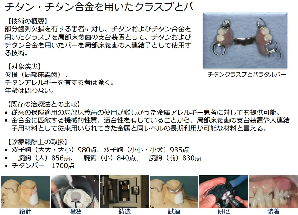 学会等から提案のあった新規医療技術に関する資料にて、「チタン・チタン合金を用いたクラスプとバー」という技術提案があったので、こちらを保険導入して、金属アレルギーの場合はこちらを使用する方向になるかもしれません。