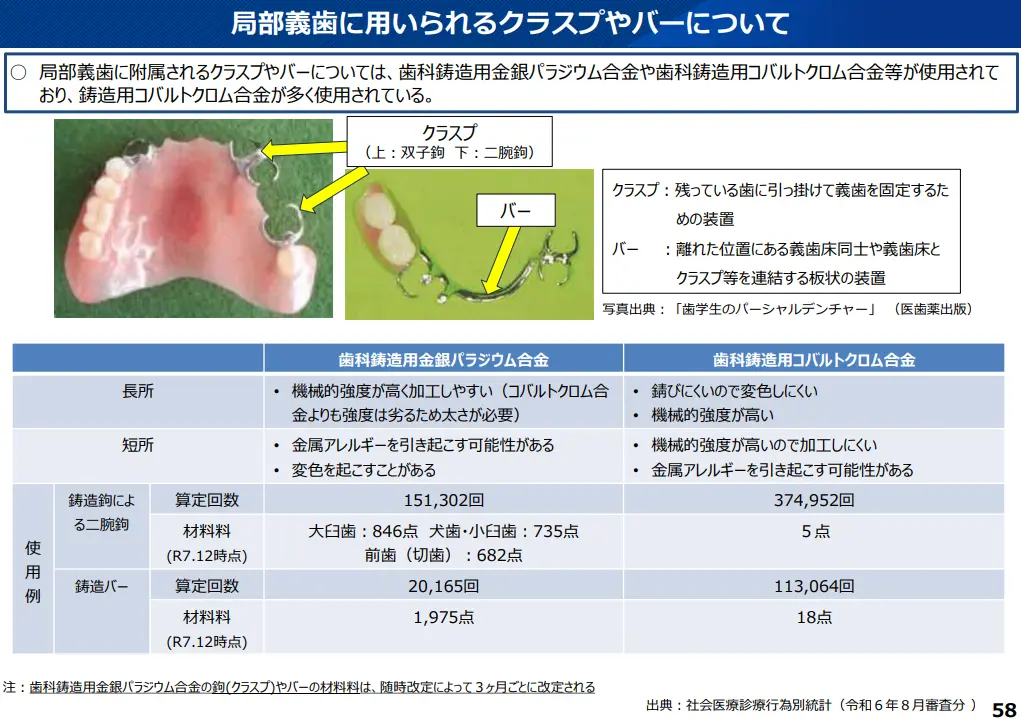 資料の中で、「局部義歯に付属されるクラスプやバーについて、歯科鋳造用金銀パラジウム合金を使用する特別の理由がある場合を除き、原則、歯科鋳造用コバルトクロム合金を使用する運用に見直すことに関してどのように考えるか?」と論点が明記されていました。