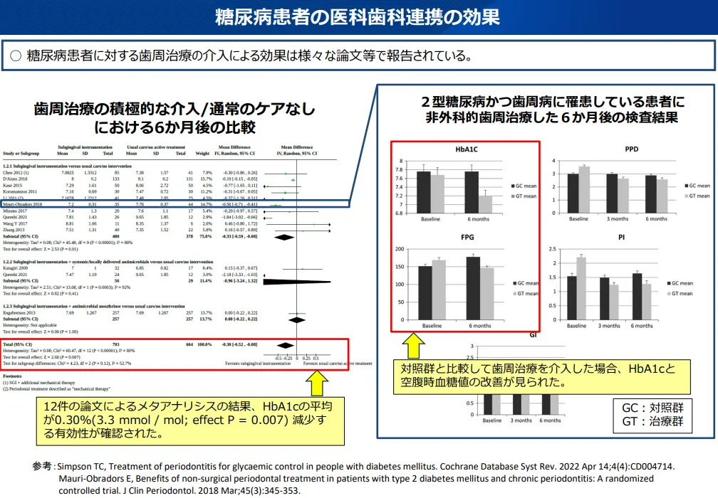 厚生労働省の資料でも、糖尿病患者に対する歯周治療の介入で、HbA1cの平均値が減少するなどの糖尿病の改善効果があることが示されています。