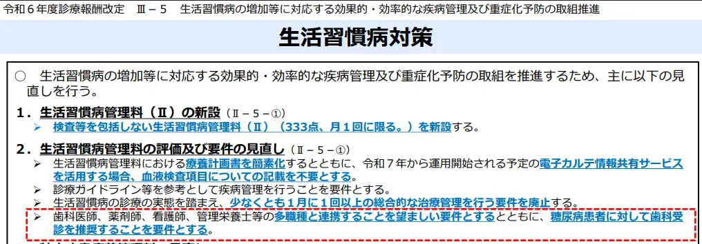 令和6年診療報酬改定で、医科の糖尿病治療に対する生活習慣病管理料の要件に、「糖尿病患者に対して歯科受診を推奨すること」が追加されました。